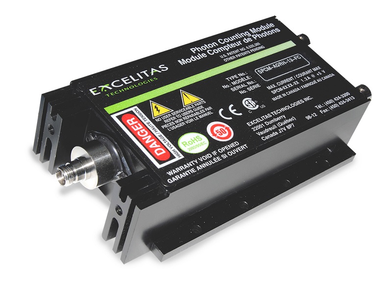 Excelitas newly enhanced SPCM-AQRH Single-Photon Counting Module detects single photons over the wavelength range of 400 nm to 1064 nm with performance parameters superior to other solid state or vacuum-tube based photon counters. Single Photon Counting Module The SPCM-AQRH uses a unique silicon avalanche photodiode (SLiK) with a circular active area, achieving peak photon detection efficiency greater than 70% at 650 nm over a 180 µm diameter, with unmatched uniformity over the full active area. A TTL-level pulse is generated for each photon detected and the signal is available at the BNC connector at the rear of the module. The photodiode is both thermoelectrically cooled and temperature controlled, ensuring stabilized performance despite ambient temperature changes. Operating temperature range has been increased and the module will function with case temperatures between 5°C and 70°C. The module comes as standard with a free-space window to the APD, with FC fiber adapter, C-mount or tube cage mount bracket/adapter options. Recent electronic circuit enhancements have reduced the minimum dead time to less than 25 ns, thereby increasing linearity and improving the dynamic range of the module. Timing resolution of the module was also improved significantly. The SPCM-AQRH has internal protection circuitry that protects the avalanche photodiode and the module electronics from damage due to accidental overload from exposure to ambient lighting. Applications - LIDAR - Quantum Cryptography - Photon correlation spectroscopy - Astronomical observation - Optical range finding - Adaptive optics - Ultra-sensitive fluorescence - Particle sizing - MicroscopyFeatures