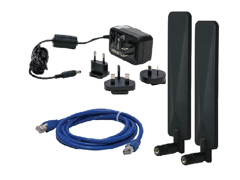 Kit includes: AC / DC power supply, 12 VDC US, EU, UK power cords Ethernet cable Cellular antenna, 2 x 2 MIMO, with GNSS Wi-Fi antenna 2 x 2 MIMO