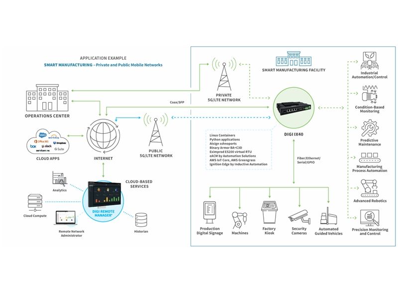 Purpose-built for Industry 4.0, Digi IX40 supports the 5G connectivity and edge intelligence needed to enable numerous use cases ranging from predictive maintenance and asset monitoring to machine learning and advanced robotics. It seamlessly connects multiple machines, whether wired or wireless, in the most demanding environments, optimizing integration of cloud-delivered operational technology (OT) services with information technology (IT) to streamline complex operations and scale IT infrastructure.