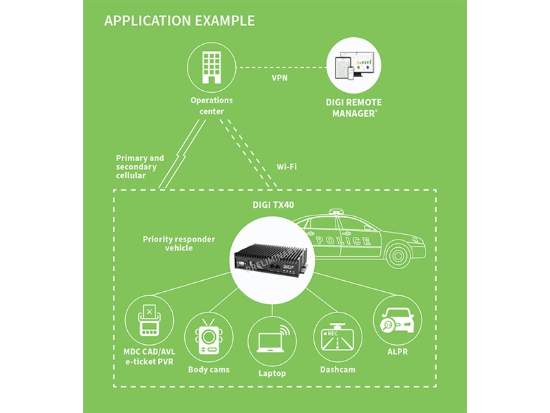 An ideal and purpose-built solution for public safety and service fleets, Digi TX40 breaks down communication silos and seamlessly connects the growing list of equipment in a vehicle into a fast and reliable vehicle area network (VAN). It enables you to digitally transform your fleet with latest generation wireless technology that is affordable, easy-to-deploy and centrally managed with Digi Remote Manager®.