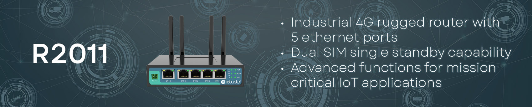 The Robustel R2011 Industrial 4G Router is a rugged router with 5 Ethernet ports, dual SIM single standby capability and a range of advanced functions for mission-critical IoT applications.